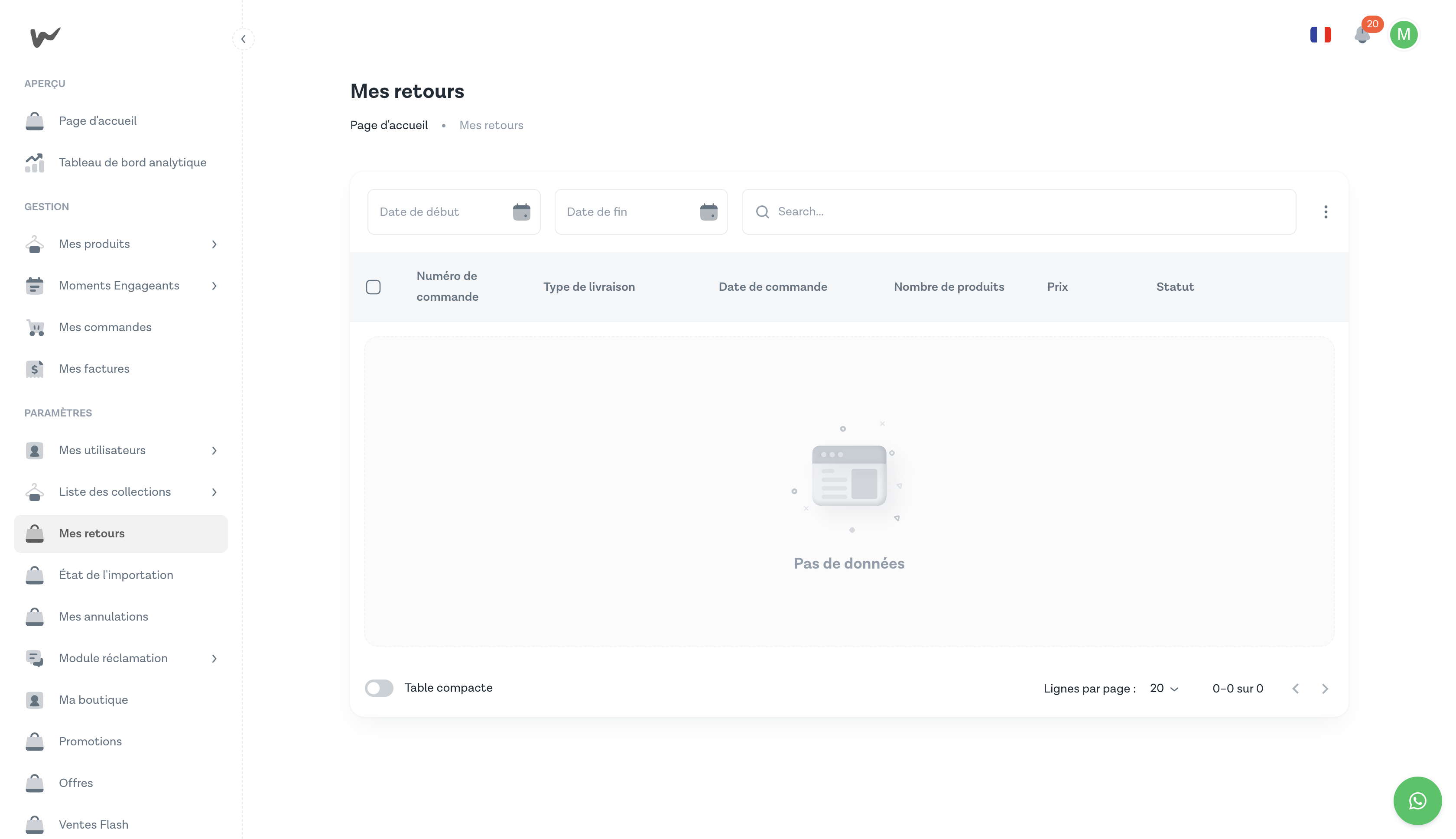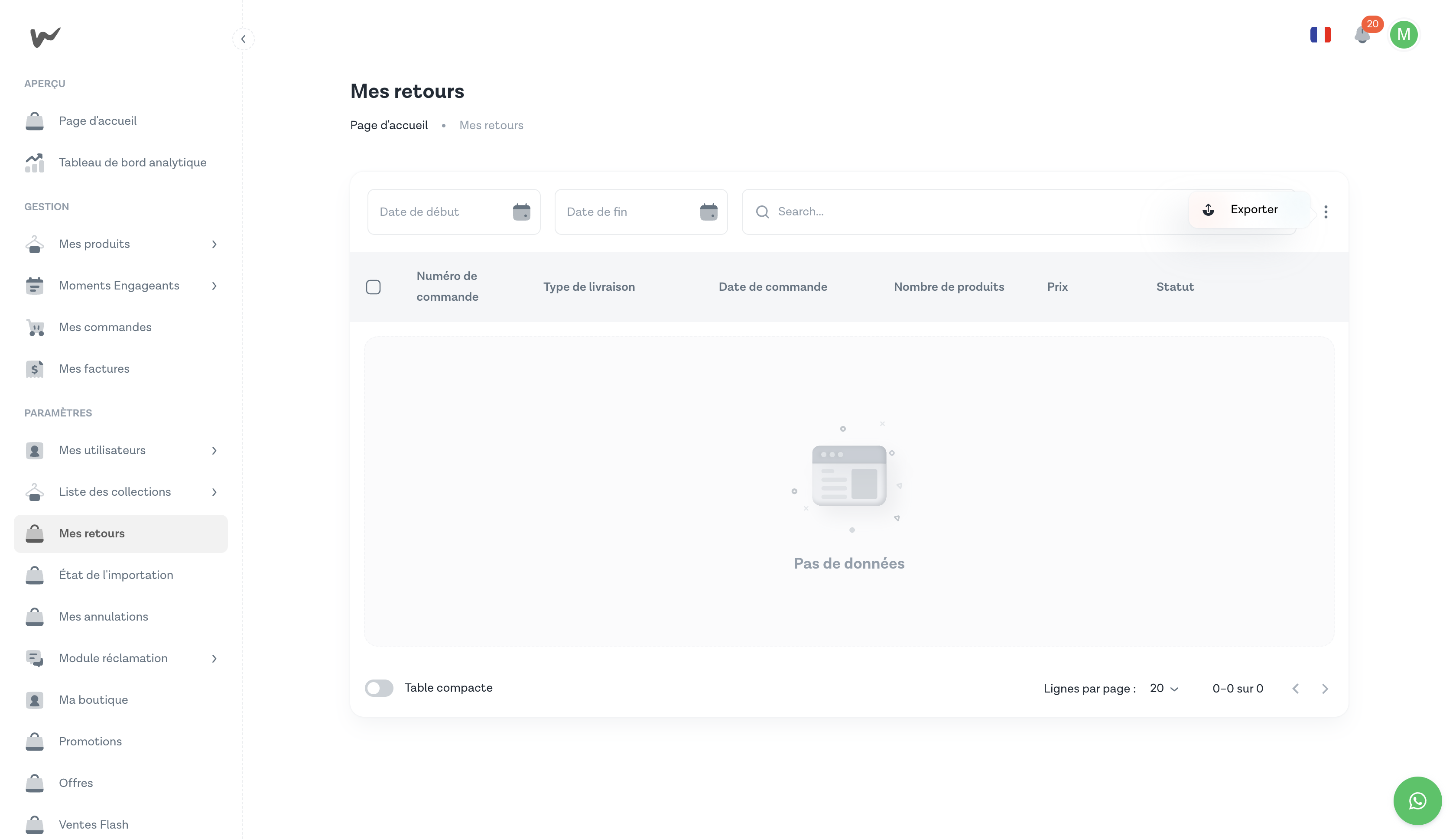 La section Mes retours se trouve sous PARAMÈTRES dans la barre latérale gauche — pas sous "Gestion". Si vous ne la voyez pas, vérifiez que votre compte vendeur est actif.