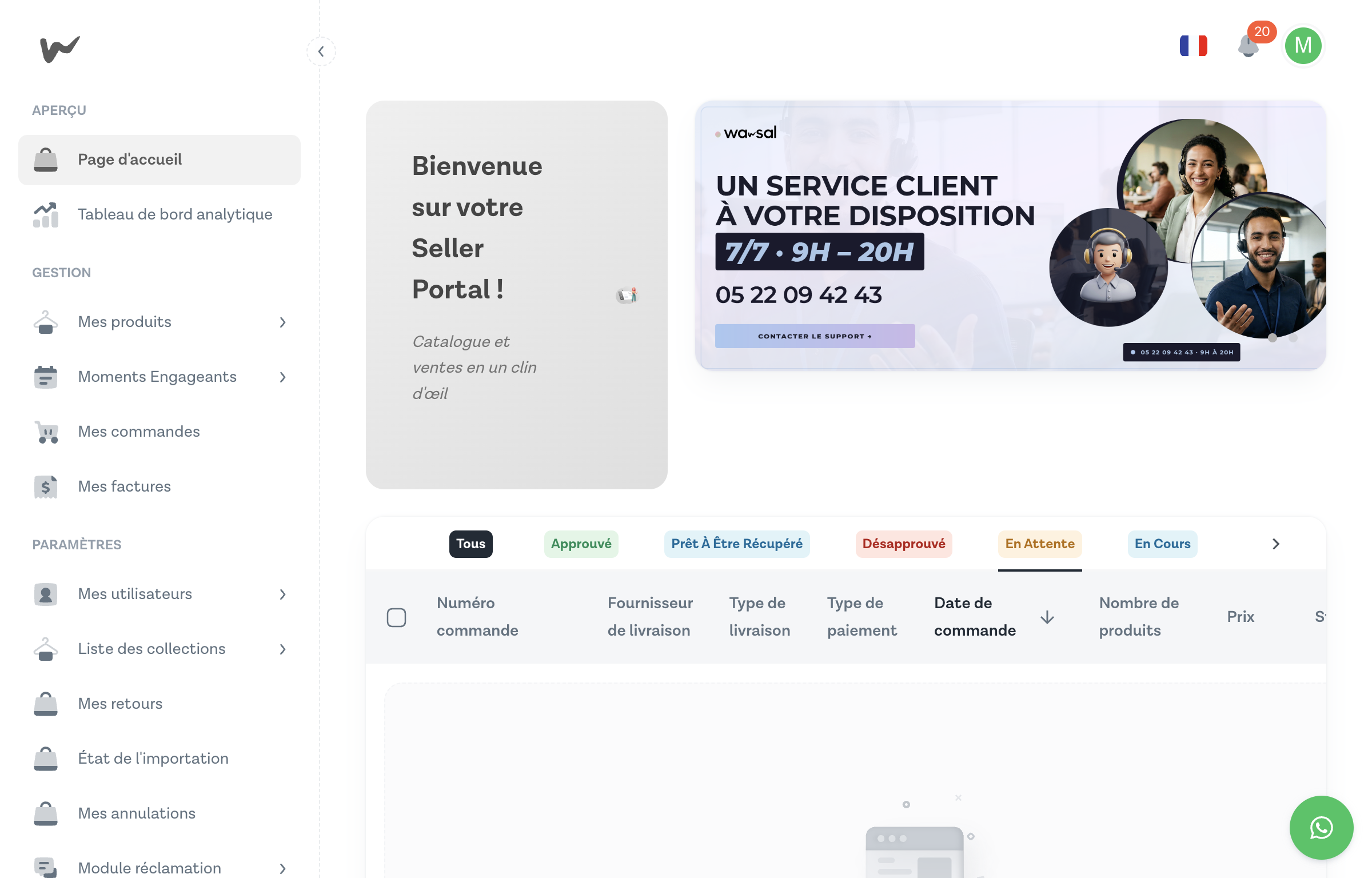 Vous venez de vous connecter pour la première fois au Seller Portal Wasal. Cet article vous présente chaque zone de l'interface pour que vous soyez à l'aise dès votre première utilisation.