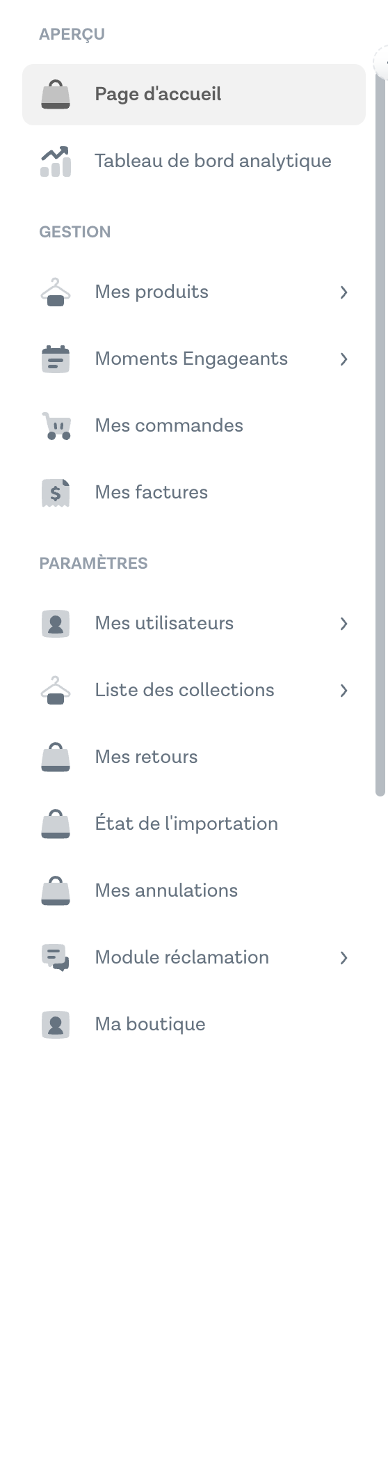 - Mes produits — créer, modifier et publier vos fiches produits. Ce menu est expandable : cliquez dessus pour voir les sous-rubriques.