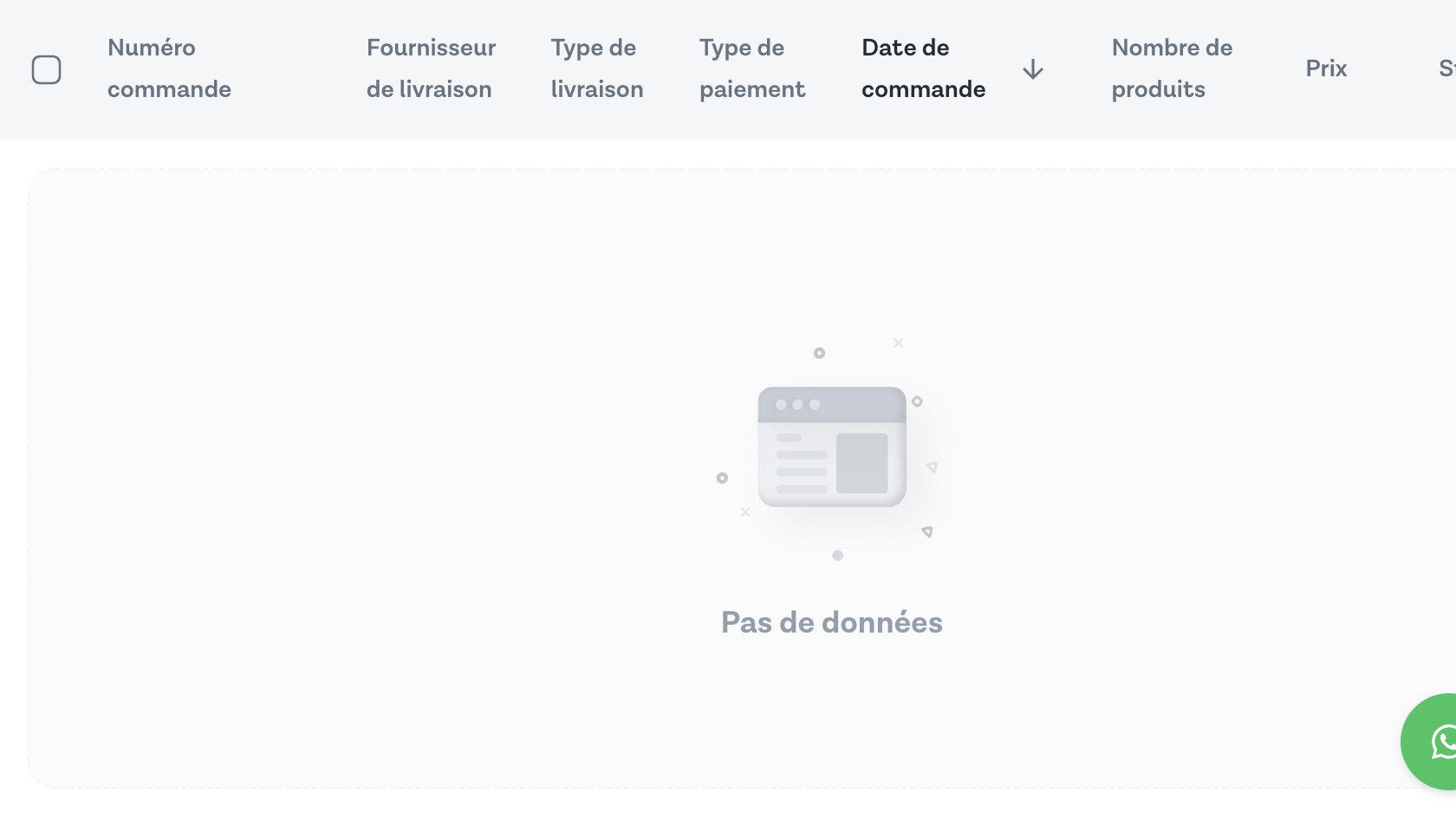 Sur la page d'accueil, le tableau des commandes affiche vos dernières commandes avec leurs informations essentielles : numéro de commande, fournisseur de livraison, type de paiement, date, nombre de produits, prix et statut.